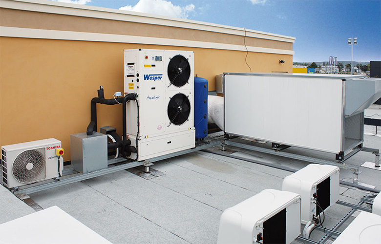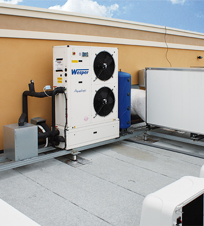 Centrale double flux haute éfficacité couplée à une pompe à chaleur air/eau régulée par un automate programmable numérique.
